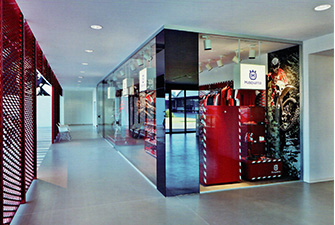 在Husqvarna摩托車總部,寶馬集團(tuán)決定委任Buratti+Battiston建筑設(shè)計(jì)團(tuán)隊(duì)來(lái)設(shè)計(jì)他們的新展廳。新建筑坐落在街道的一旁,用兩層高的全透明的玻璃墻打造。議會(huì)室、專賣店、摩托車的陳列室也可兼作老式摩托車的展覽廳。這個(gè)展廳主要是以紅色網(wǎng)格狀的金屬材質(zhì)打造,使展廳被一層一層的“面”包裹著,遠(yuǎn)觀會(huì)留給人留下非常深刻的印象。
